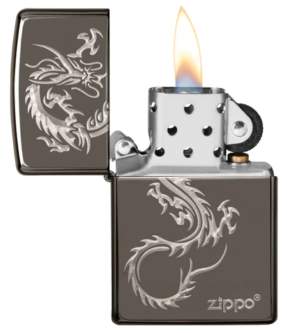 Expand you dragon lighter collection with this new design. Using laser fancy fill this Chinese dragon comes to life. Finished on a Black Ice® lighter. This design is perfect for you collection. Comes packaged in a gift box. For optimum performance, fill with Zippo lighter fuel.
