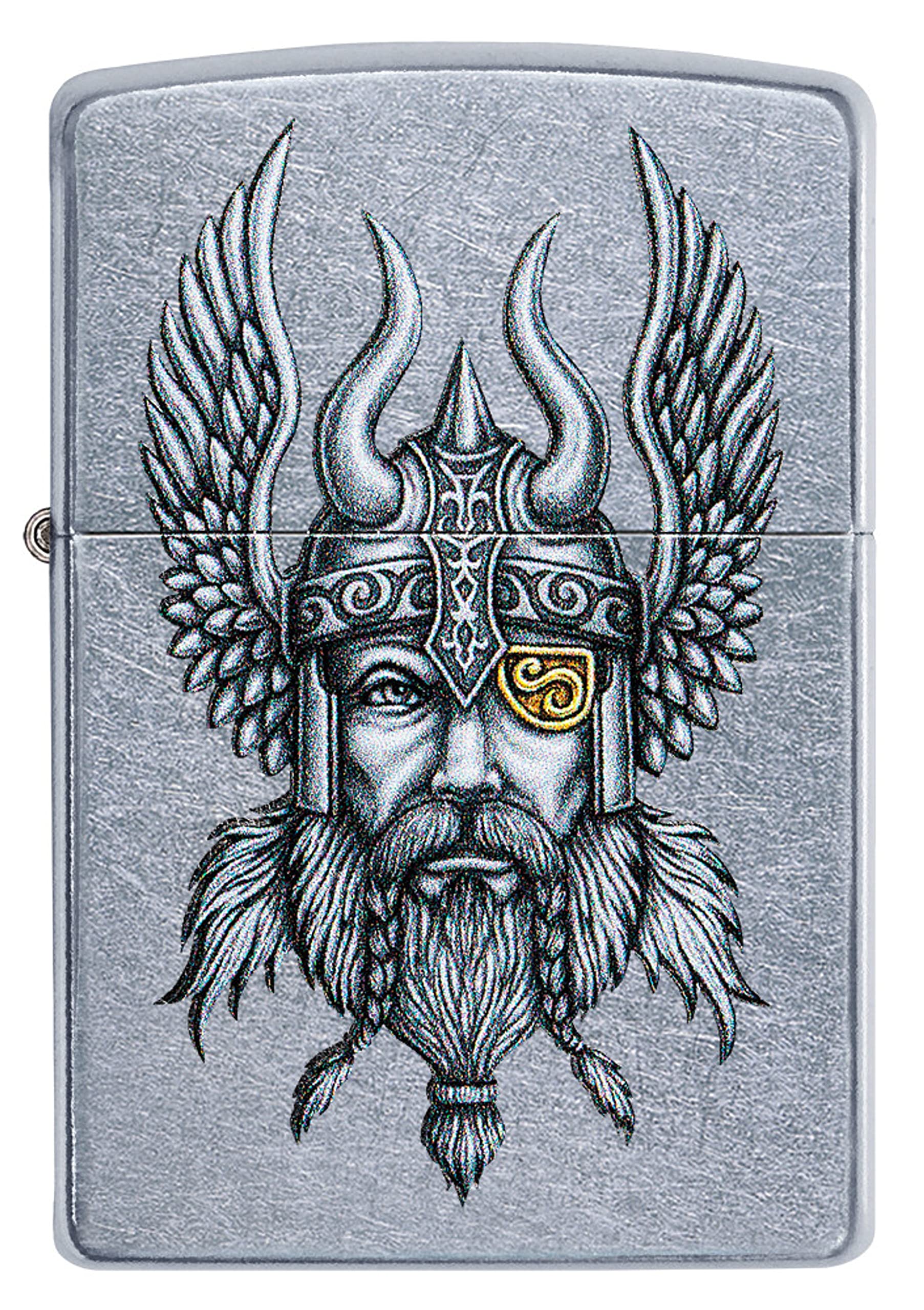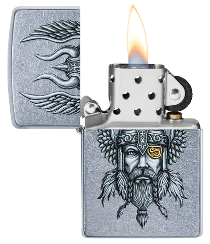 This Nordic Viking makes an appearance, for the first time on a Street Chrome™ lighter. Zippo’s in-house artists continue to produce spectacular original artwork to adorn the windproof lighter. This hand-drawn design was originally created with pen and ink, then carefully digitally-transferred to preserve the intricate layers of detail and shading to be reproduced with Zippo’s colour imaging process. Comes packaged in a gift box. For optimal performance, fill with Zippo lighter fluid.